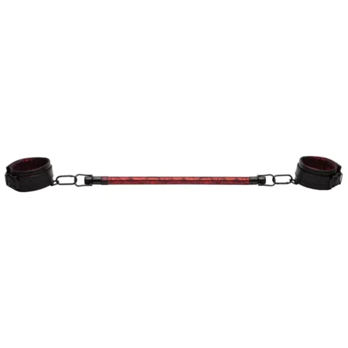 A 17,5 hüvelykes terpesztőrúd kiváló kezdők számára, hogy felfedezzék az új pozíciós lehetőségeket a BDSM játék során. A fordítható, fekete és piros-rózsa mintájú dizájn stílusossá és izgalmassá teszi az élményt. A párnázott műbőr boka bilincsek kényelmes rögzítést biztosítanak, és állítható csatos záródással vannak ellátva. A rúd mindkét végén D-rögzítőgyűrűk találhatók, így sokoldalú használatot tesz lehetővé. A csomaghoz egy szatén tárolótáska is tartozik a diszkrét tároláshoz.