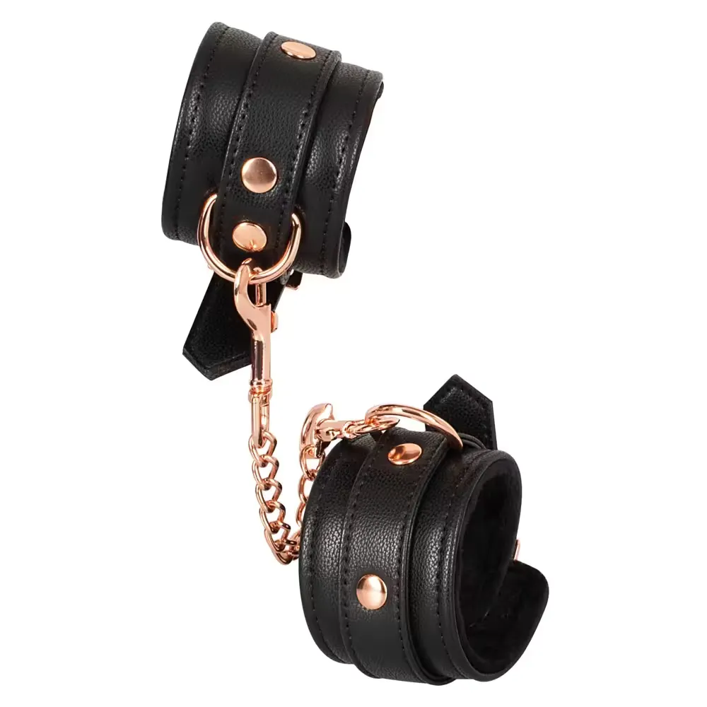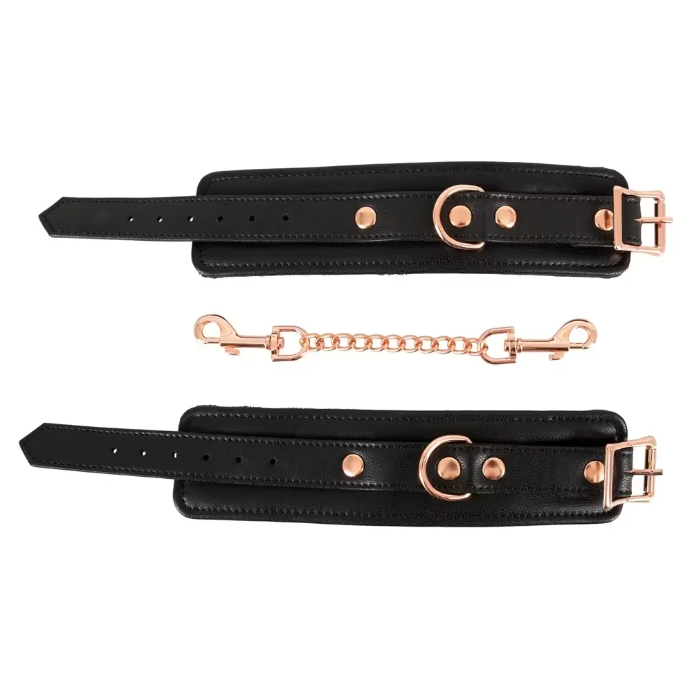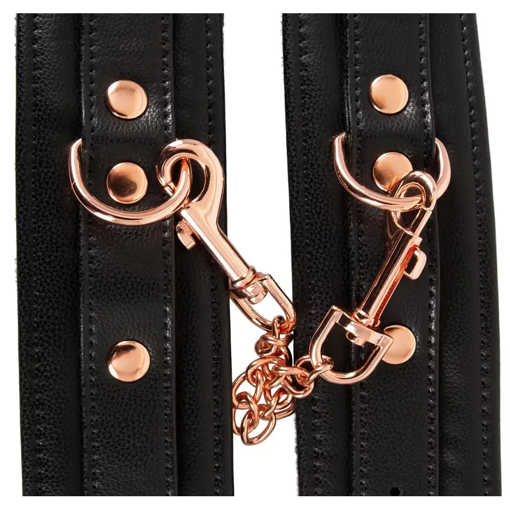 Formatervezés: A bilincsek belső része puha plüss béléssel van ellátva, ami kényelmes viseletet biztosít. A külső rész stílusos bőrhatású poliuretán, amely elegáns megjelenést kölcsönöz. A rosegold fém részek és a lánc tovább fokozzák a bilincsek esztétikai értékét, miközben a D-rögzítőgyűrűk biztosítják a lánc stabil rögzítését.