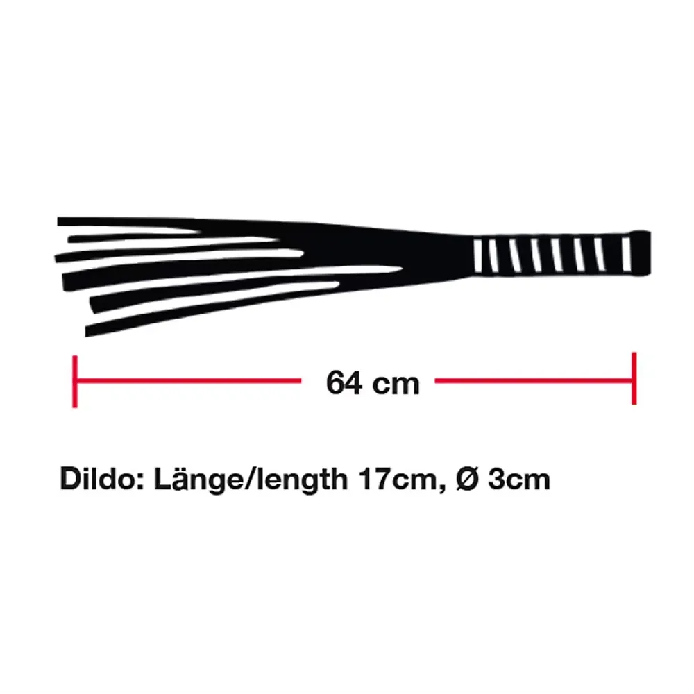 A korbács puha, valódi bőrszálai tökéletesek gyengéd érintésekhez vagy intenzívebb használathoz. Az üveg nyél barázdált kialakítása ergonomikus fogást biztosít, és dildóként is használható, így sokoldalú eszköz a szerepjátékok során.