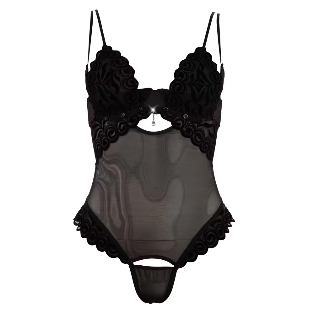 A Cottelli LINGERIE bársonyos, variálható body-ja tökéletes választás az érzéki megjelenésért és a különleges pillanatokért. Ez a fekete, áttetsző body rugalmas powernet anyagból készült, amely kényelmes viseletet biztosít. A body különlegessége, hogy a kosarak és a szeméremrész lepatentolható, így maximálisan variálható és izgalmas megjelenést kínál. A dekoltázsnál elhelyezett strasszos díszítés elegáns csillogást ad a darabnak. A bársonyos hímzések és az állítható pántok tovább növelik a body kifinomultságát, miközben tökéletesen testhez simuló fazont biztosítanak. Különleges alkalmakra, például romantikus estékhez ajánlott.