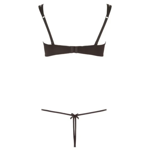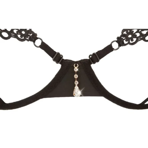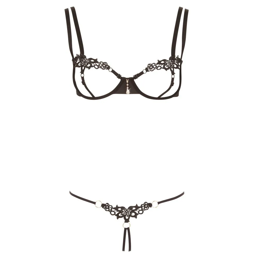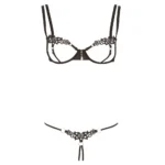 A Cottelli csillogó hímzett melltartó szettje az érzéki minimalizmus jegyében készült. A nyitott kosarú melltartó különleges kialakítása aprólékos hímzéssel díszített, amely azonnal magára vonja a figyelmet. A szett része egy T-fazonú, nyitott tanga, amely elöl hímzett virágokkal, valamint aranyszínű gyűrűkkel van ellátva. A rugalmas pántok és az állítható melltartó pántok biztosítják a tökéletes illeszkedést és kényelmet. Ez a szett ideális választás romantikus estékhez, Valentin-napra vagy évfordulók megünneplésére. A csillogó strasszokkal és hímzett virágmintákkal díszített részletek garantáltan különleges megjelenést nyújtanak.