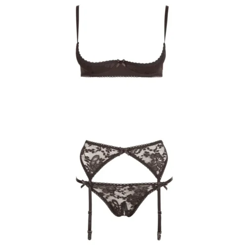 A Cottelli - erotik-trió egy érzéki és provokatív fehérnemű szett, amely tökéletes választás különleges alkalmakra és romantikus estékhez. A szett egy alacsonykosaras, merevített és enyhén bélelt mellemelőből, egy nyitott tangából és egy elegáns harisnyatartóból áll. Az összes darab puha, ruganyos fekete csipkéből készült, amely finoman követi a test vonalát. Az állítható pántok és a hátul négy kapoccsal záródó melltartó biztosítják a kényelmes és tökéletes illeszkedést. A harisnyatartó gyorszárral rendelkezik, így könnyen használható. A csipkés anyag romantikus és csábító megjelenést kölcsönöz ennek a különleges fehérnemű együttesnek.