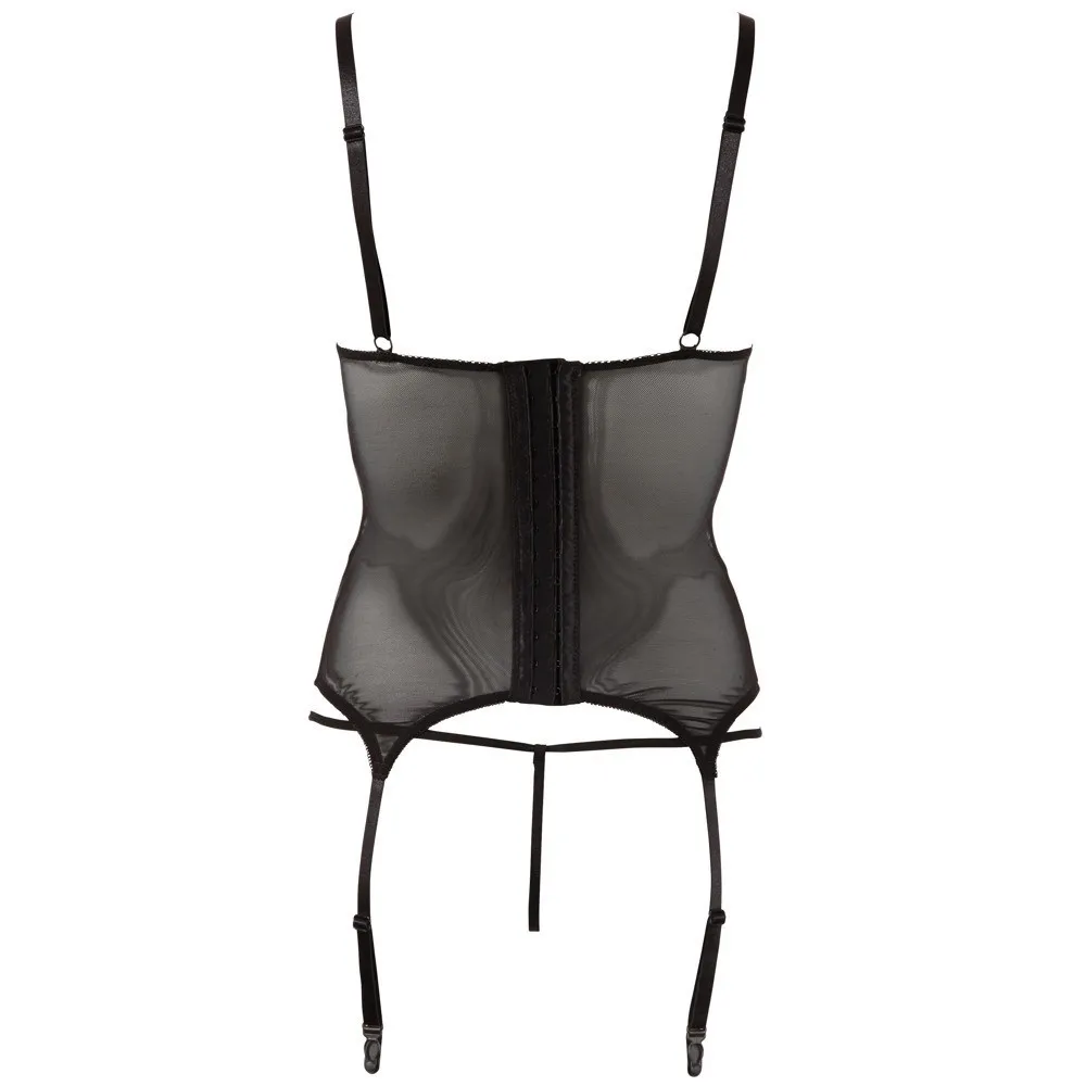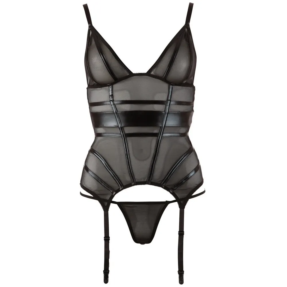 A Cottelli - fényes csíkos, áttetsző felső egy érzéki és elegáns darab, amely tökéletes választás különleges alkalmakra. Az áttetsző anyag finoman sejteti a vonalakat, míg az elöl található fényes csíkok kihangsúlyozzák a nőies formákat. A mély dekoltázs és a vékony vállpántok csábító megjelenést kölcsönöznek. A hátul kapcsokkal záródó kialakítás és az állítható harisnyatartó-pántok biztosítják a kényelmes viseletet. A szett tartalmaz egy hozzáillő áttetsző tangát is, amely teljessé teszi a megjelenést.