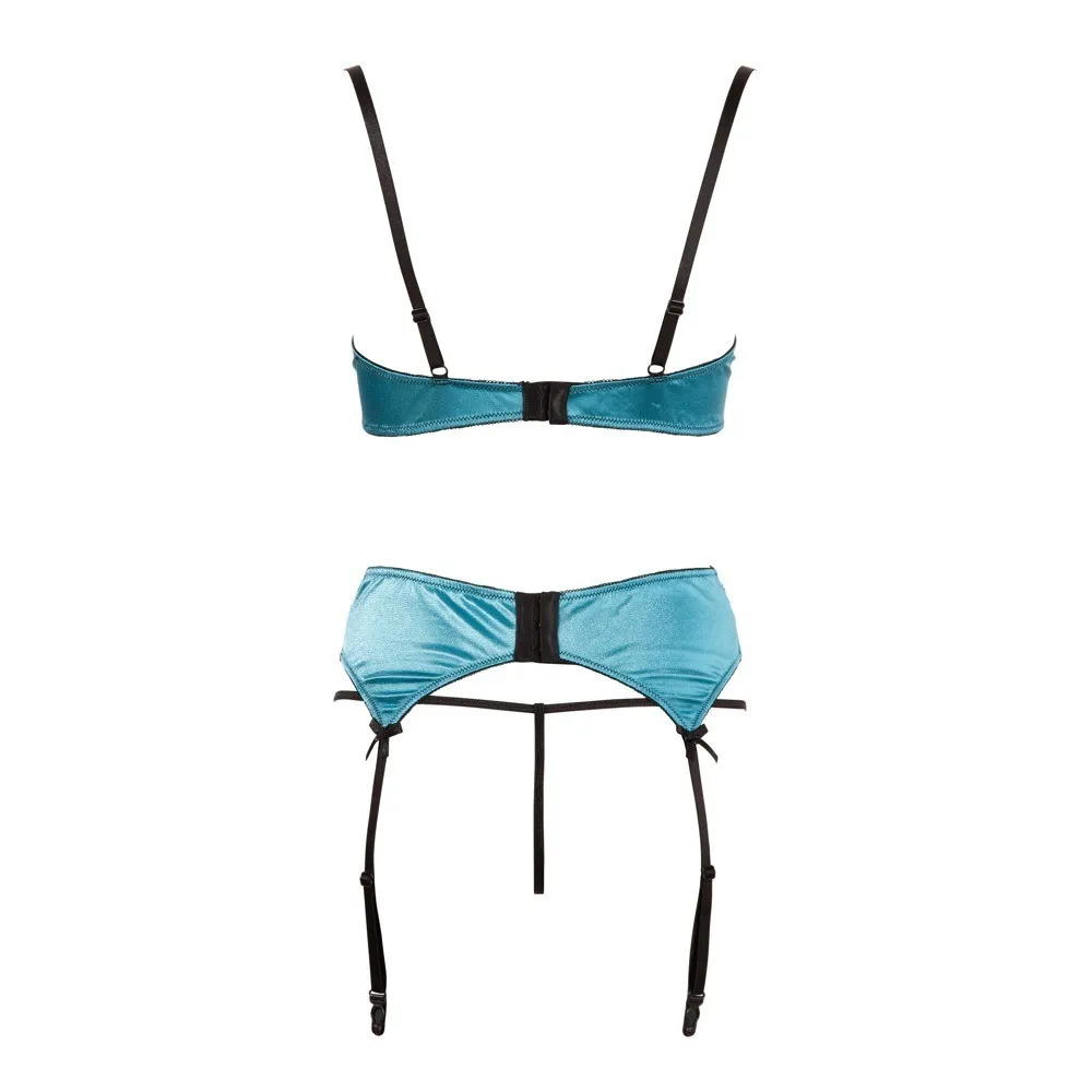 - Egyedi előnyök: Háromrészes szett, mellemelő csipkés kialakítással, strasszos díszítés a harisnyatartón, szeméremnél nyitott tanga, állítható pántok.