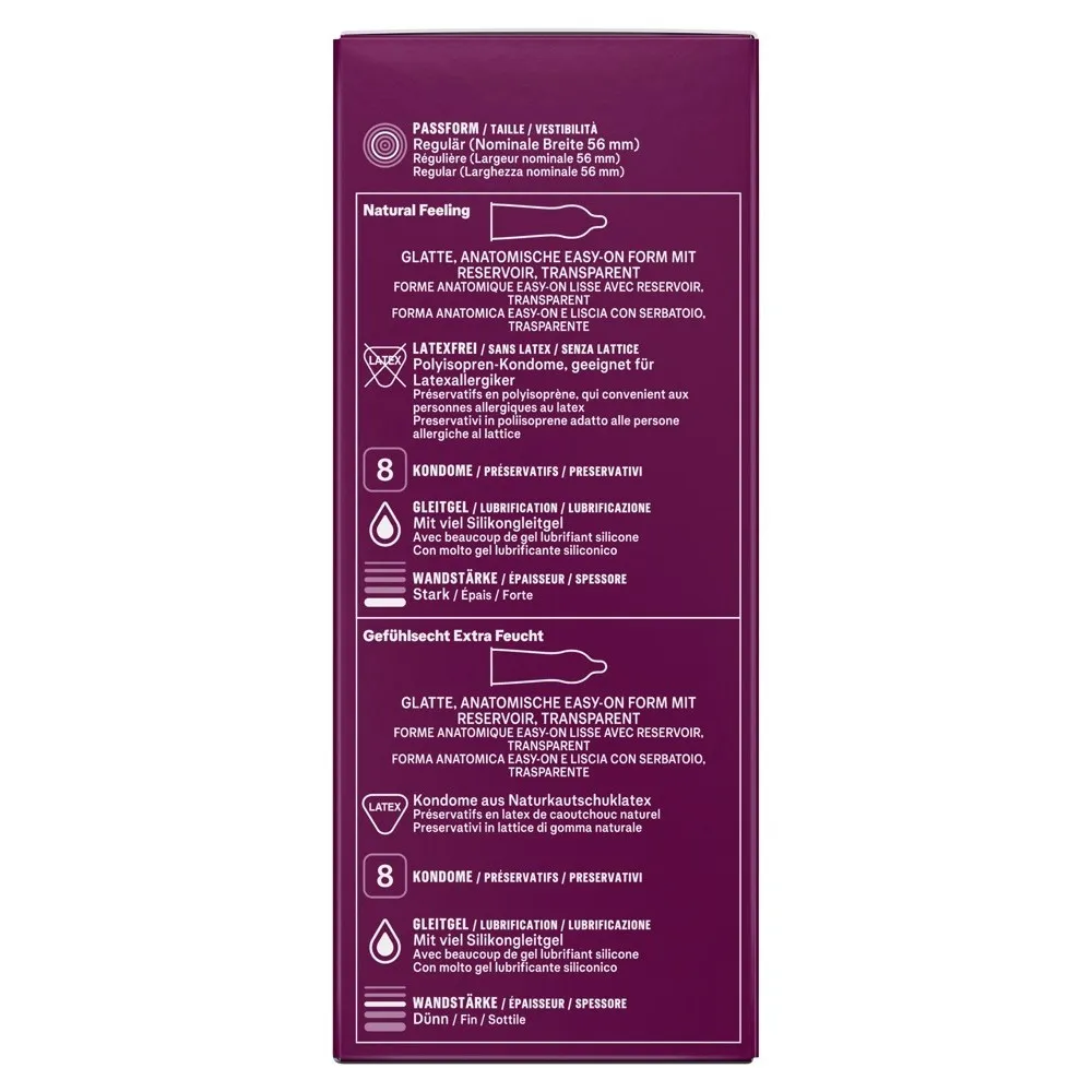 Vaginális, orális és anális együttlétekhez használható, eltérő felületű és síkosítású típusokkal. Anyaga természetes gumi latex, a latexmentes változat poliizoprénből készül. Felülete típustól függően sima, bordázott vagy pontozott. Síkosítása standard vagy extra, illetve egyes típusok Desirex géllel bevontak. Névleges szélessége 56 mm. Ízesített változatot is tartalmaz. Egyszer használatos.