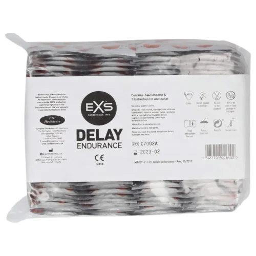 Az óvszer egy speciális, benzokain bevonattal rendelkezik, amely segít csökkenteni az érzékenységet, így hozzájárul a késleltetett ejakulációhoz és az elnyújtott élvezethez. Egyenes falú kialakítása és ondótartálya biztosítja a kényelmes és biztonságos használatot. A prémium minőségű natúr latexből készült EXS Delay óvszer selymes textúrával rendelkezik, amely természetes érzetet nyújt mindkét fél számára.
