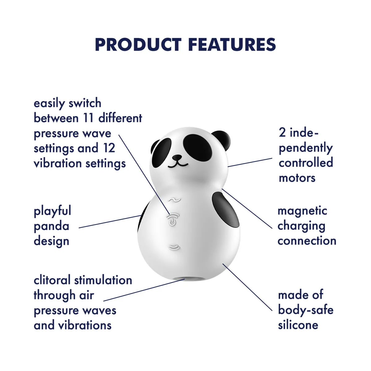 Tapasztald meg a pandasztikus pillanatokat a Satisfyer Pocket Panda léghullámos csiklóizgatóval! Ez az aranyos panda formájú vibrátor ideális választás kezdők és profik számára egyaránt. A Satisfyer Air Pulse technológiának köszönhetően érintésmentes nyomáshullámokkal kényezteti a csiklót, amelyet a vibrációs funkcióval kombinálva még intenzívebb élményt nyújt. A 11 nyomáshullám-intenzitás és a 12 vibrációs program révén maximális sokoldalúságot kínál.
