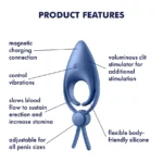 Formatervezés: Ergonomikus és modern kialakítás, elkeskenyedő csiklóstimulátorral, amely minden mozdulattal extra örömet nyújt. Az állítható méretű gyűrűk kényelmes és sokoldalú használatot biztosítanak.