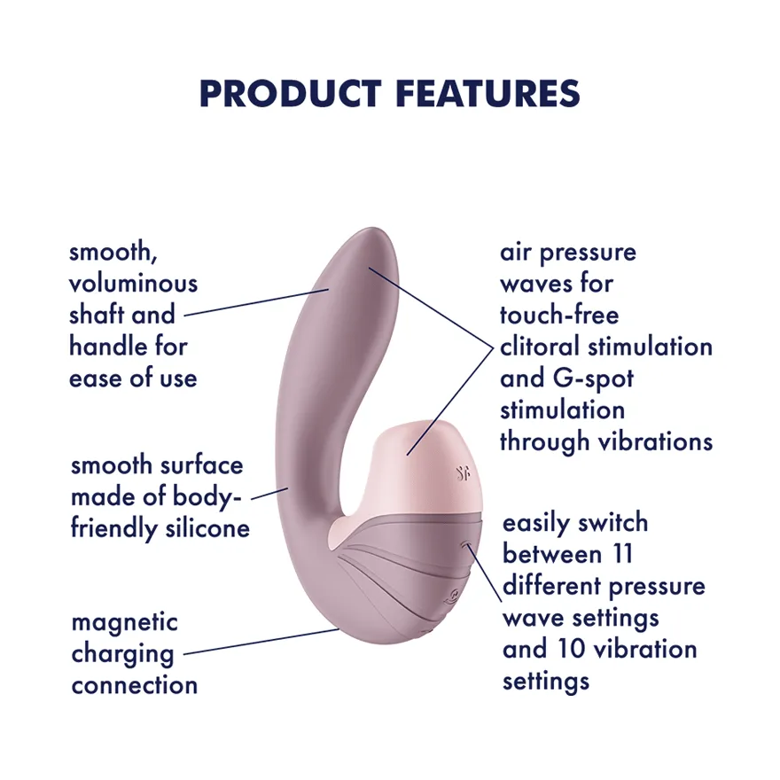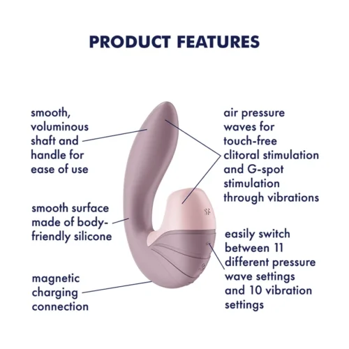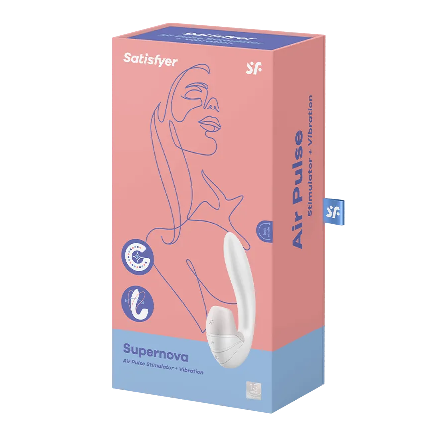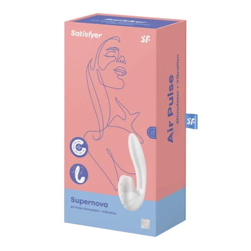A Satisfyer Supernova 2in1 vibrátor a csikló és a G-pont egyidejű stimulációjára tervezték, egyedi nyomáshullám-technológiával és erőteljes rezgésekkel. A rugalmas kialakításnak köszönhetően könnyen igazítható a test egyedi anatómiájához, így maximális kényelmet és hatékonyságot biztosít.