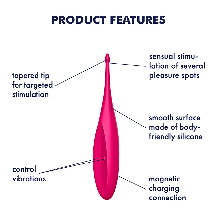 A Satisfyer Twirling Fun bőrbarát szilikonból és ABS műanyagból készült. Ezek a hipoallergén anyagok gyengédek a bőrhöz, könnyen tisztíthatók, és rendkívül higiénikusak. A keskeny, merev csúcs lehetővé teszi a pontos stimulációt, míg az ergonomikus nyél kényelmes fogást biztosít.
