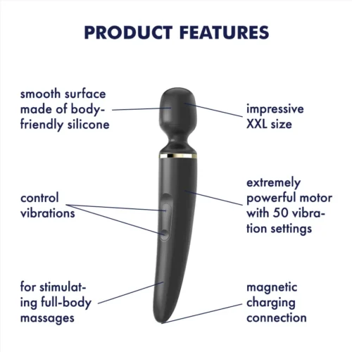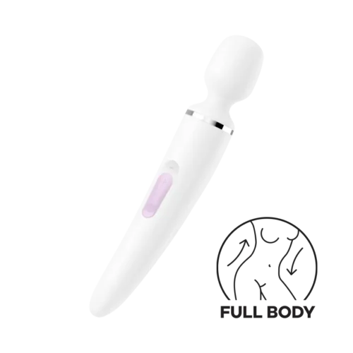 A Satisfyer Wand-er Woman masszírozó vibrátor egyedülálló wellness-eszköz, amely az egész test kényeztetésére alkalmas. XXL méretének és erőteljes vibrációinak köszönhetően nemcsak relaxáló masszázsra használható, hanem a legintimebb pontok stimulálására is. A puha, bőrbarát szilikonból készült bársonyos fej és a sima tengely kényelmes használatot és egyszerű tisztíthatóságot biztosít.