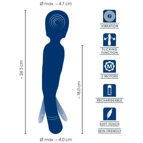 Ez a kétvégű masszázspálca belső és külső stimulációra egyaránt alkalmas, ergonomikus kialakítása kényelmes fogást biztosít. A puha, testbarát szilikon simán siklik a bőrön, így a használat rendkívül komfortos. Két erős, de halk motor változatos élményt kínál a masszázsfejen és a nyelven is. A hosszú, ergonomikus nyél lehetővé teszi, hogy a nyelvet vaginálisan vagy análisan is használhassuk, ezzel egyedülálló élményt biztosítva. Könnyen tisztítható és karbantartható, így hosszú távon is higiénikus marad.