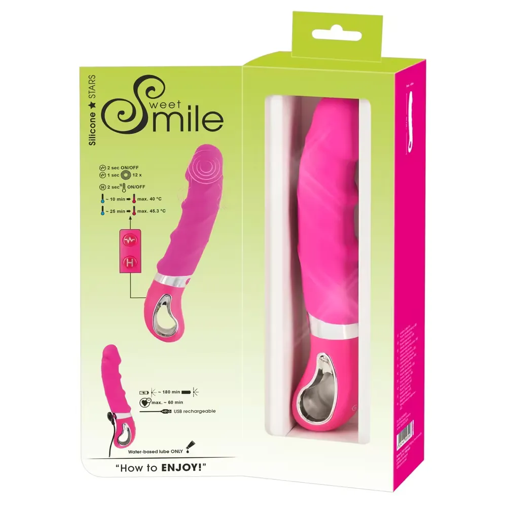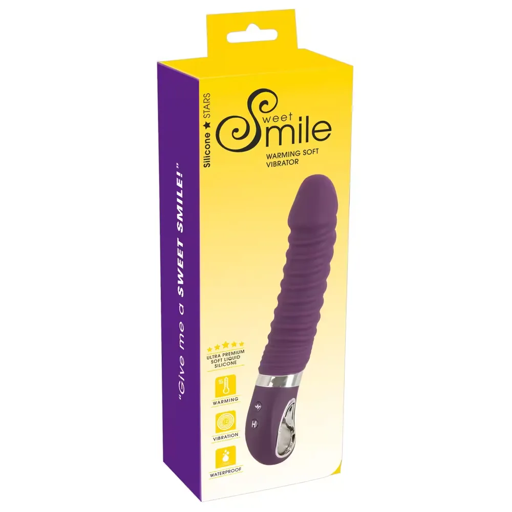 A Sweet Smile Warming Soft Vibrator egy lila, pink színű, rugalmas vibrátor, amely különleges melegítő funkcióval rendelkezik, így a testhőmérsékletre, körülbelül 45°C-ra melegszik fel, valósághű és kényelmes érzetet biztosítva. A vibrátor enyhén barázdált textúrája fokozott stimulációt kínál a test felszínén és belsejében egyaránt. A 12 különböző vibrációs mód könnyen kezelhető, így változatos élvezetet nyújt. Vízálló kialakításának köszönhetően a vibrátor zuhany alatt vagy fürdőben is használható, így bárhol élvezhető a különleges élmény.