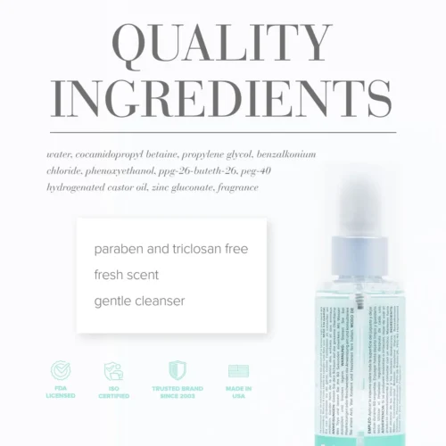 Víz (Aqua), Cocamidopropyl Betaine, Propilén-glikol, Benzalkónium-klorid, Fenoxietanol, PPG-26-Buteth-26, PEG-40 Hidrogénezett ricinusolaj, Cink-glükonát, Illatanyag.