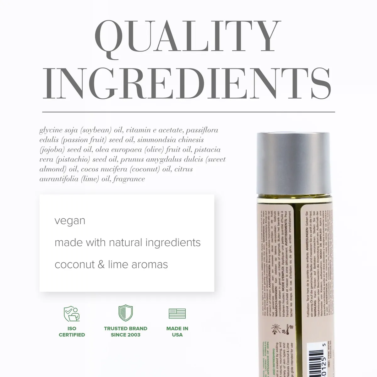 A termék vegán, kizárólag növényi eredetű olajokból áll, beleértve a szójabab-, jojoba-, olíva- és kókuszolajat. Ezek az összetevők mélyen táplálják a bőrt, miközben hosszantartó csúszósságot biztosítanak a masszázs során. A kókusz és lime aromája természetes afrodiziákumként is funkcionál, így tökéletes választás romantikus pillanatokhoz.