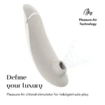 A Womanizer Premium 2 léghullámos csiklóizgató egy luxusminőségű készülék, amely a Womanizer forradalmi Pleasure Air technológiáját alkalmazza. Ez a technológia érintés nélküli stimulációt biztosít, gyengéd légáramlatokkal masszírozva a csiklót, ezzel páratlan orgazmusélményt nyújtva. A 14 intenzitási szint között mindenki megtalálhatja a számára megfelelő erősséget.